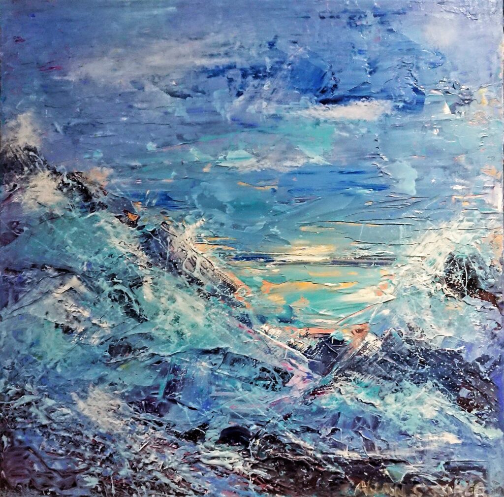 Allan Storer paints in luscious looking oils using a palette knife. His work from St. Ives is often done en plein air and has a fresh, lively feel. Often Allan paints his waves whilst standing in the sea in his wet suit with an easel and paint. Watching him paint can be a exhilarating experience. His recent work captures the excitement and changeability of an ever-moving St. Ives sea and sky. Allan’s abstracts and seascapes are always multi-layered and thick with paint. Looking closely, one can sometimes sense the area of town or the beach that has served as his inspiration. Allan has a long association with the town of St. Ives, going back to the 1960s and makes a point of knowing the town’s art history and its cultural significance. His St. Ives work is exclusive us at Art House Gallery.